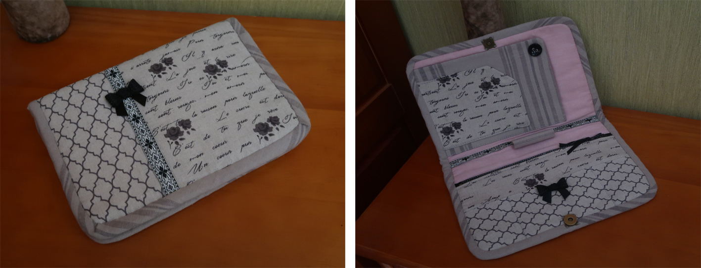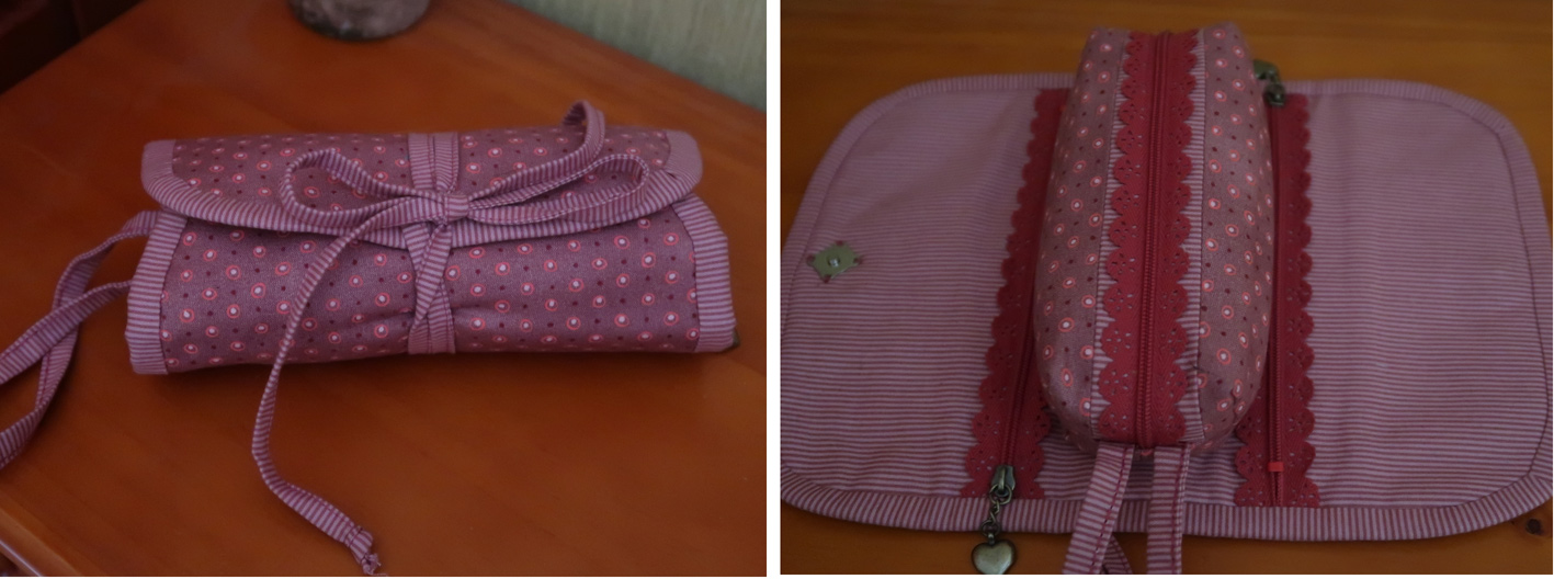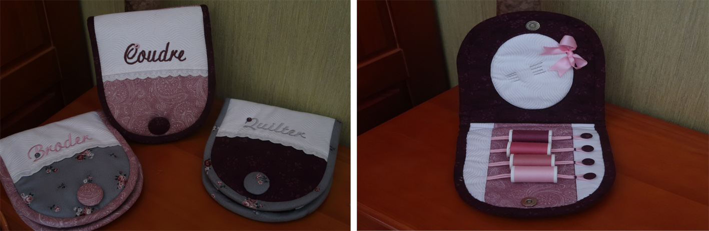 4 emplacements bobines, pique-aiguilles, poche zippée au dos, fermeture aimantée