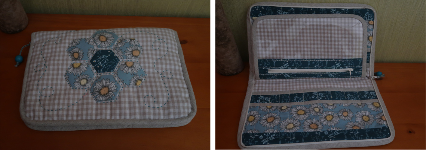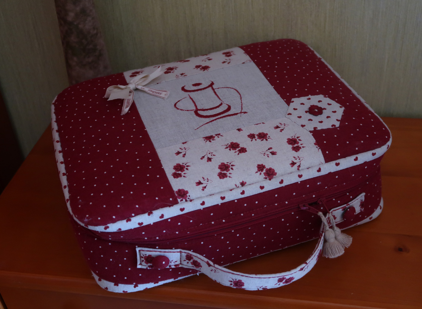 3 compartiments, 1 grande poche zippée, pique-aiguilles, dimensions = 20 x 20 cm