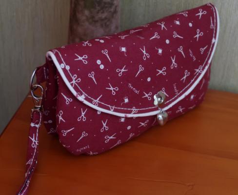 4 compartiments, fermoirs tourniquets, dragonne amovible, dimensions = 30 x 26 cm