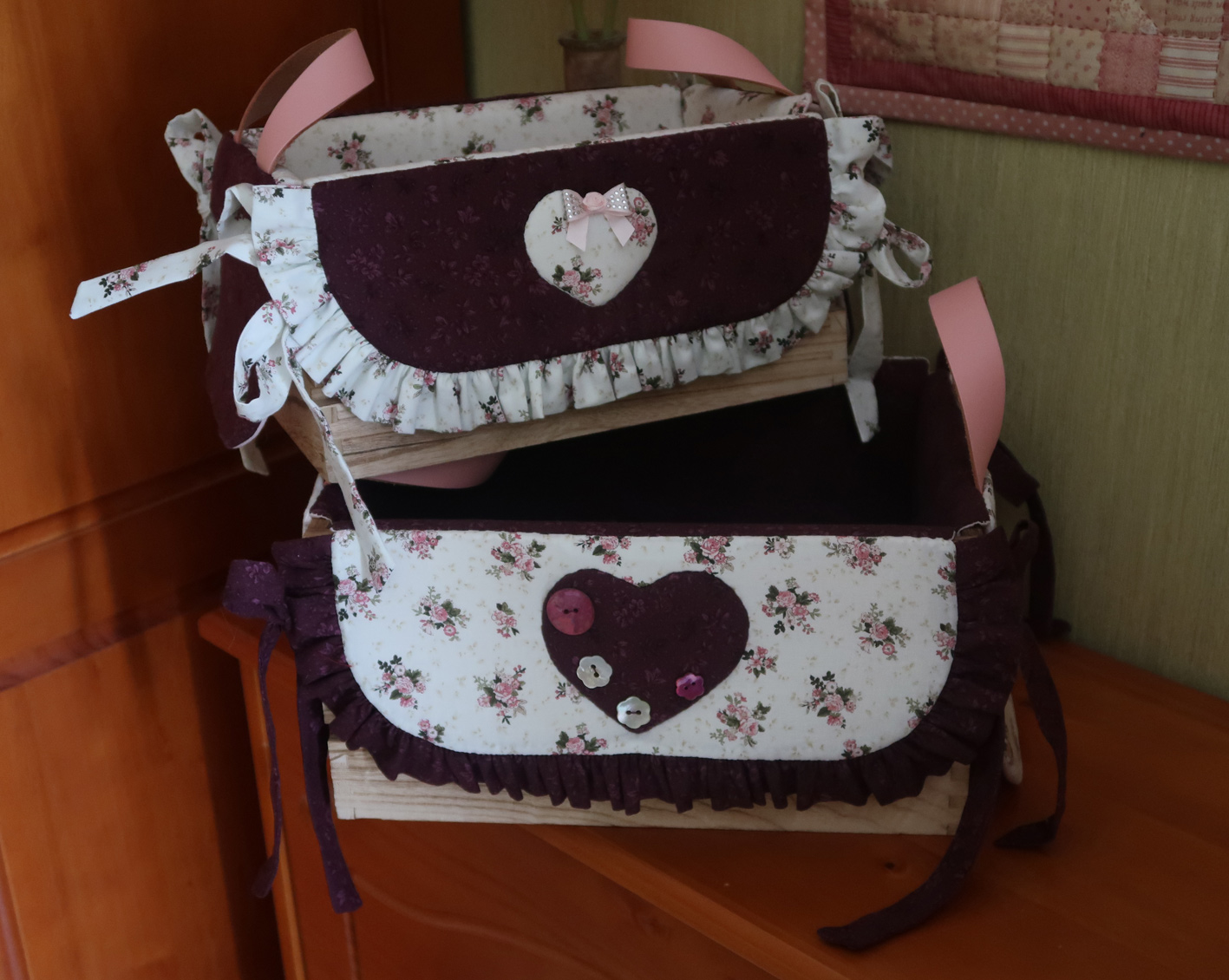 Casiers bois, anses cuir, habillage tissu matelassé.